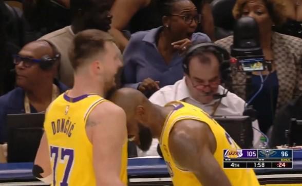 谈到第四节末段自己在即将出界的情况下投进一记匪夷所思的压哨球后,詹姆斯用头撞了他一下庆祝时,东契奇笑着说道:“我夸他给我做了一个很棒的掩护。”